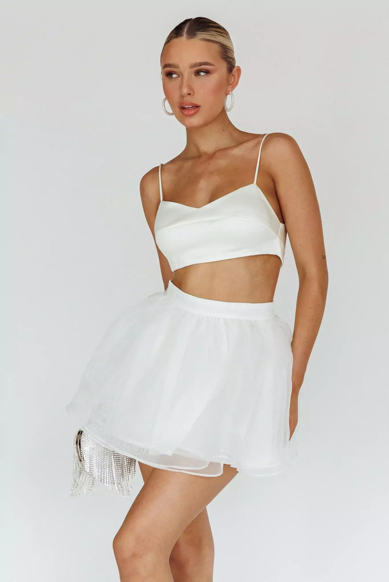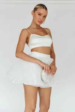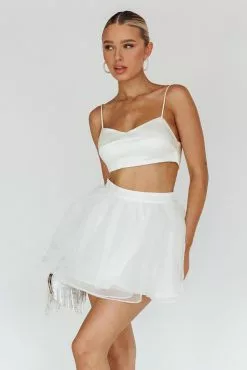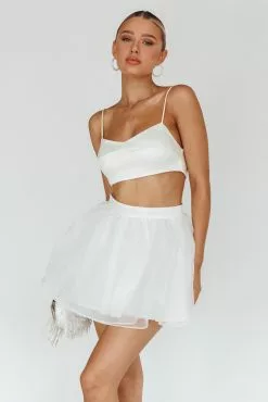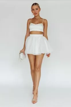 Turn heads in our super cute Karrie mini skirt. It’s giving ballet core and we are here for it! Perfect for a bachelorette or girls’ night out! Team it with our The Moment crop top and a clutch for an unforgettable look.