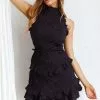 Make them stop and stare in our gorgeous Kenzie mini dress. Perfect for a flirty date with your crush. We are in love with its frill-trimmed bust and string-tie shoulders! Team it with a mini tote and simple mules for a head turning look.