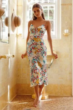 Selfie Leslie Lake Como Fitted Bodice Cami Strap Midi Dress Floral Paint Green