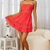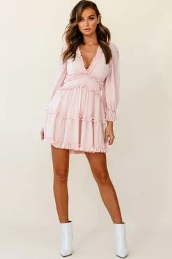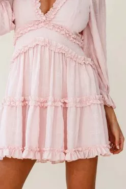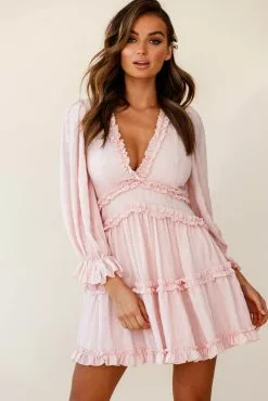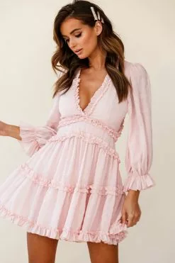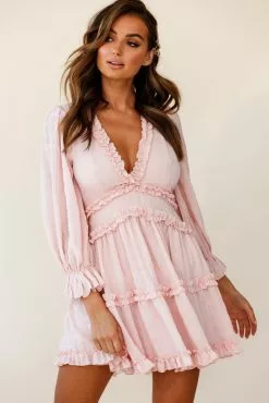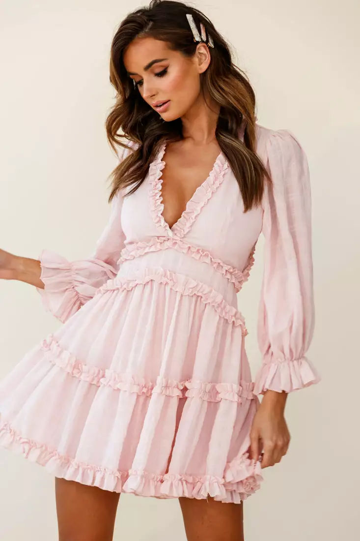 Laney. She’s ALL that. And you will be too in this super cute dress featuring three-quarter balloon sleeves, a delicate ruffle trim around the skirt, torso and neckline and our favorite part: the most adorable cutout back feature trimmed with the same pretty ruffle detail echoed throughout the dress. The fabric is soft and floaty and there’s a lining under the skirt and bust for modesty. Wear it on a girl’s night out with strappy nude heels or ankle boots for a look we are loving.