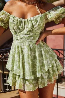 Selfie Leslie Linka Off-Shoulder Tie Back Romper Floral Stencil Print Green