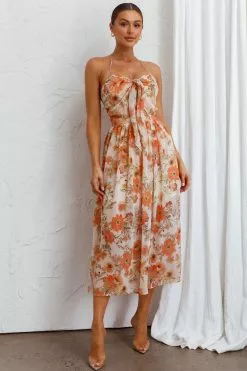 Selfie Leslie Los Feliz Tied Bust Halterneck Midi Dress Floral Beige