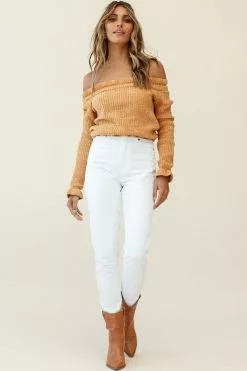 Snuggle up while looking ultra chic in our Mackenzie knit top. Featuring an off-shoulder style, long sleeves and frill hem. Perfect for a movie date teamed with jeans or a skirt and boots.