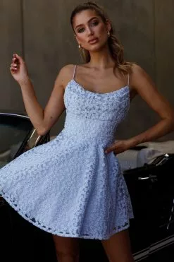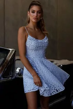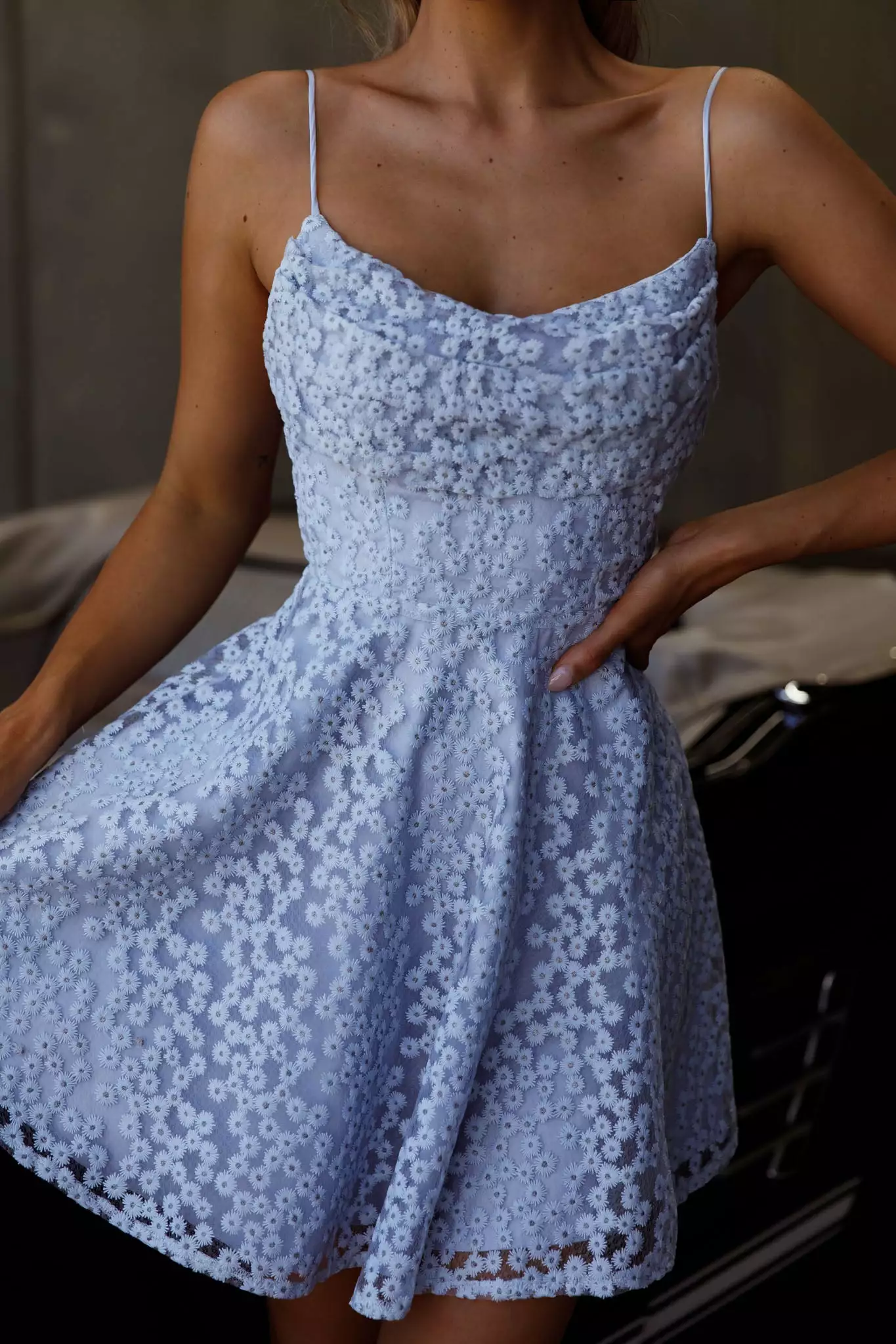 Selfie Leslie Marbella Floral Embroidered Overlay Scoop Neck Mini Dress Steel Blue