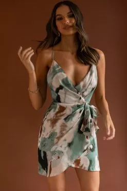 - Blue watercolor print wrap dress