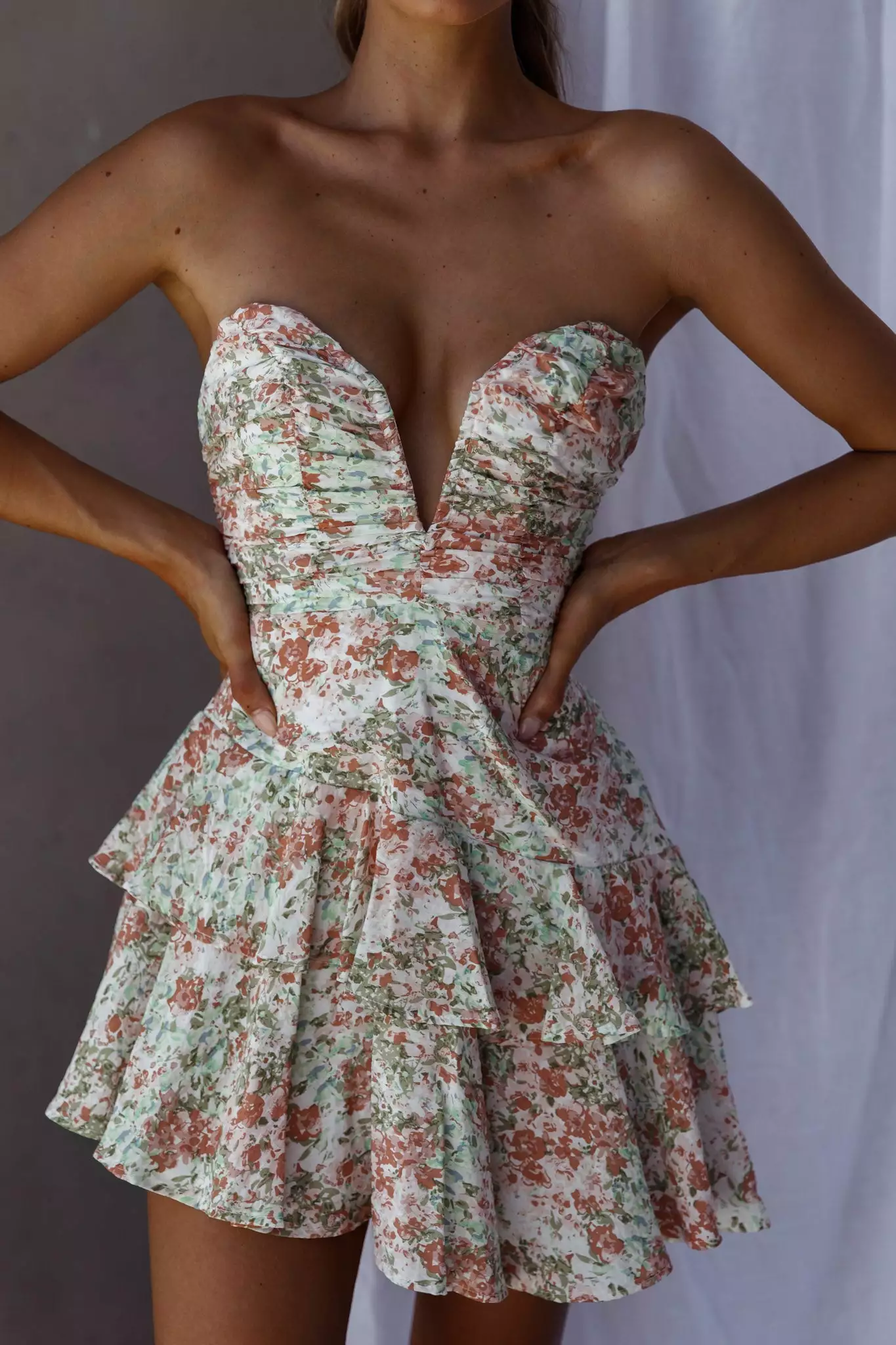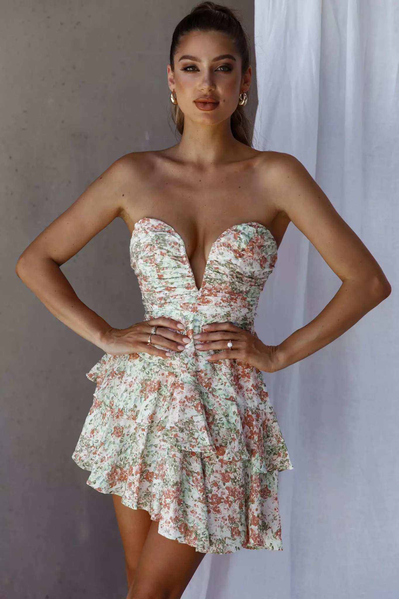Make an entrance in our super hot Milana mini dress. Featuring on-trend ruching in the bodice and a layered hem. We are loving this for a flirty date night at a chic bar teamed with a small tote, gold earrings and tan mules.