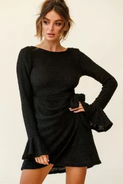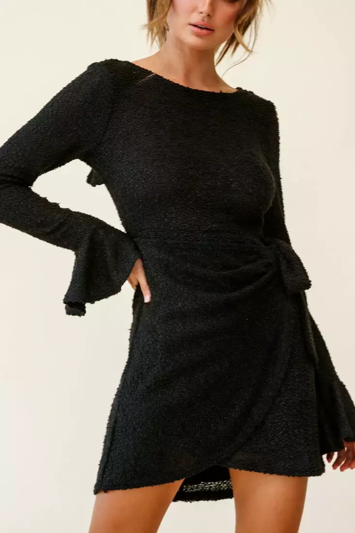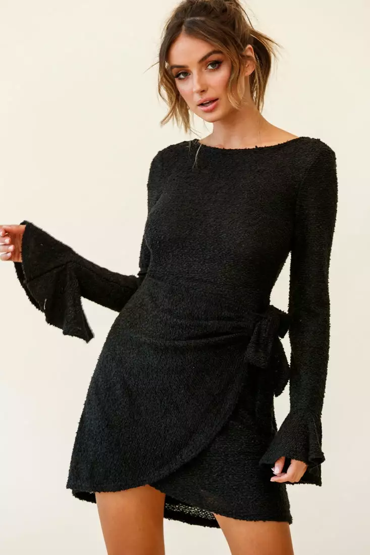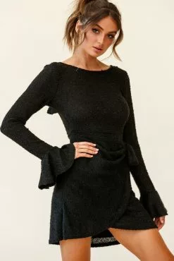 Strut your stuff in our gorgeous Minerva dress. Partially lined, it features a chunky knit fabric, long sleeves with flared cuffs, wrap skirt, and invisible zipper and button closure in the back. Take it from day to night with some pointed toe pumps and gold accent jewelry.