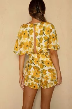 Selfie Leslie Nadi V-Neckline Wrap Romper Flower Paint Print Yellow