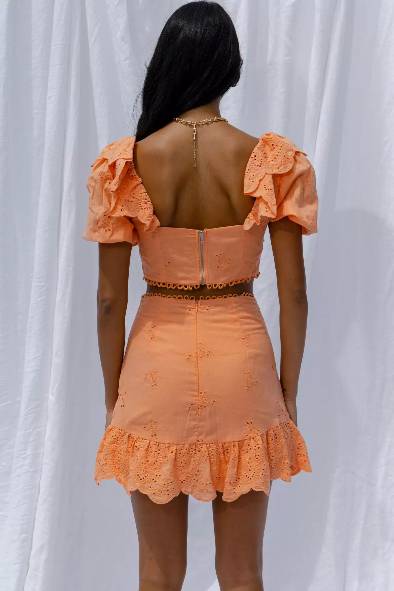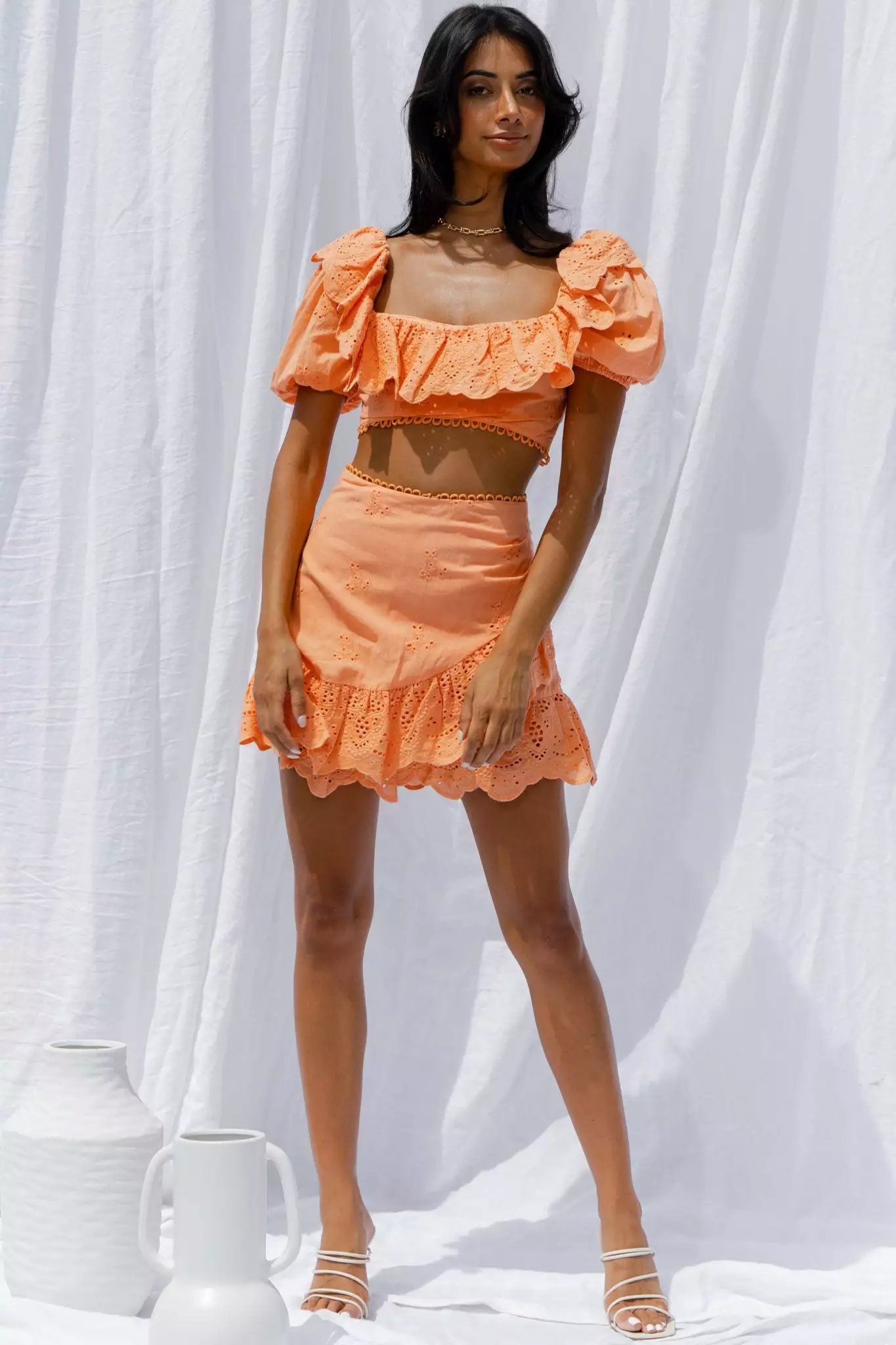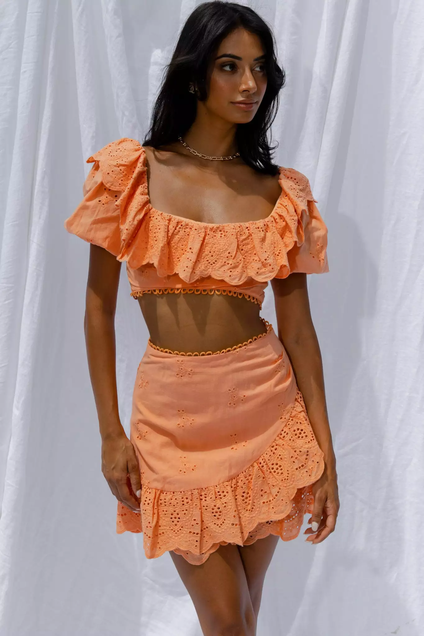 You’re a real cutie in our New Moon crop top. We are loving its scalloped, ruffle trim and eyelet embroidery throughout. Perfect for a first date or lunches with your girls. Team it with its matching skirt and nude mules for a look that’ll steal the show.