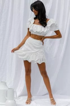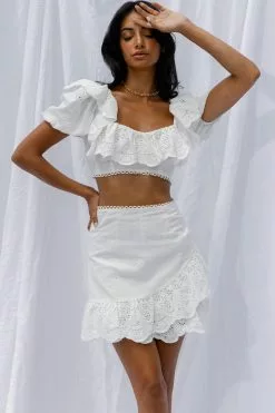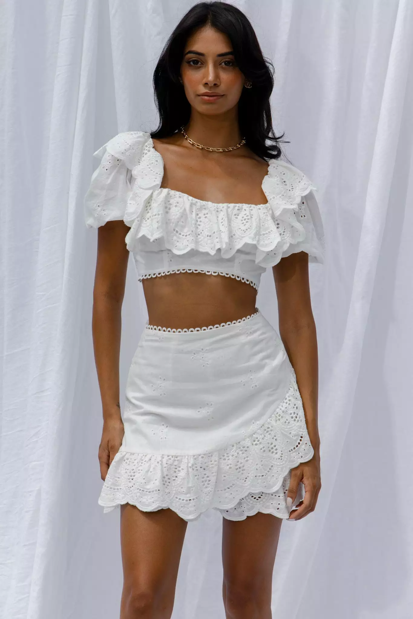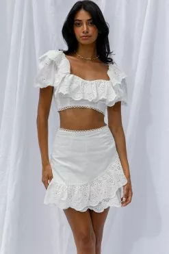 You’re a real cutie in our New Moon crop top. We are loving its scalloped, ruffle trim and eyelet embroidery throughout. Perfect for a first date or lunches with your girls. Team it with its matching skirt and nude mules for a look that’ll steal the show.