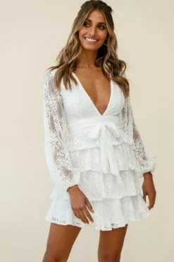 Make an entrance in our stunning Queensland dress. Partially lined, it features gorgeous lace fabric throughout, long balloon sleeves, a gorgeous tiered frill skirt, deep V-neckline and a belted waist tie. This dress oozes flirty and fun. Perfect for a birthday party or date night, teamed with nude pumps and a clutch.