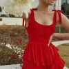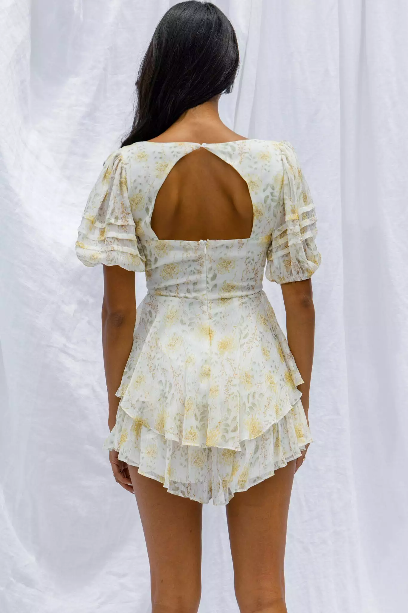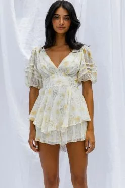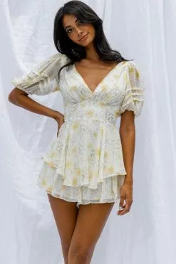 Spring has sprung and our Sun Drops romper is just what you need for weekend lunch dates with your girls and picnics with your crush. We are in love with its feminine silhouette and layered hem. Team it with tan mules and a purse for a look we can’t get enough of.