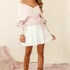 You’ll be the talk of the town in this gorgeous midi skirt. We are obsessed with its lace fabric throughout, not to mention the super cute circle trim and the cascading ruffle hem. Perfect for weekend brunches with bae teamed with its matching crop top, tan mules and a tote.