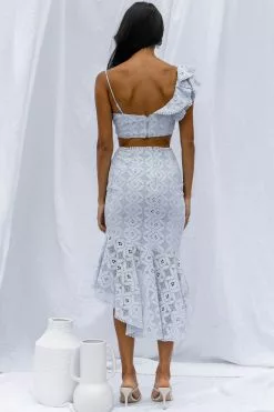 You’ll be the talk of the town in this gorgeous crop top. We are obsessed with its lace fabric throughout, not to mention the super cute circle trim in the shoulder ruffle. Perfect for weekend brunches with bae teamed with its matching skirt, tan mules and a tote.