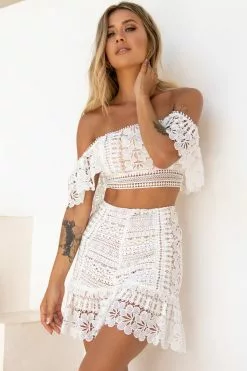 Cause a commotion in our gorgeous Tallulah top. The off-shoulder trend is so hot right now and we are loving the pretty crochet throughout. Perfect for a day date with your new crush teamed with its matching skirt, mules and a tote.