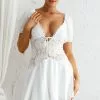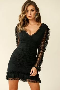 Cause a commotion in our gorgeous Tamara dress. Partially lined, it features a lace mesh overlay with frill trimming, long sleeves, ruching detail down the front and a scooped back. Perfect for a romantic dinner date with bae teamed with nude pumps and a clutch. Love!
