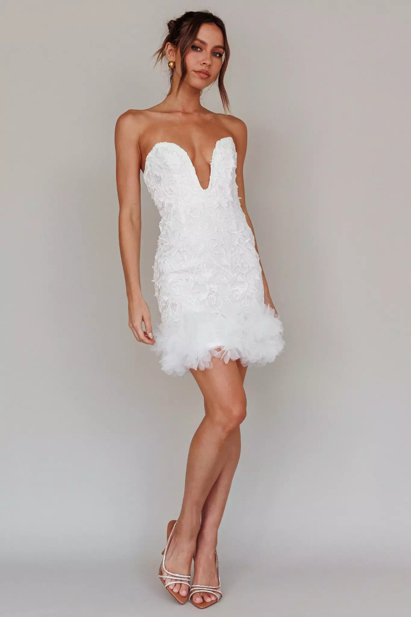 You will steal the limelight in our stunning Time Of My Life mini dress. We are obsessed with its pretty applique overlay and unique floral mesh hem. Perfect as a reception dress or wear it for a special birthday celebration. Team it with white stilettos and a clutch for a look that will make jaws drop.