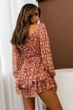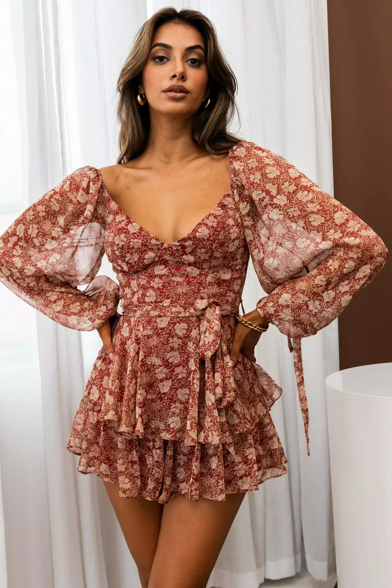Selfie Leslie True Love Long Balloon Sleeve Layered Flounce Romper Floral Print Wine