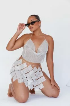 This is a super fun and flirty mini skirt covered with diamante. It’s made of iridescent sequins that are not too heavy so it won’t weigh you down while dancing all night but still makes you feel sexy. It’s perfect for clubs, festivals, fetes, concerts and parties–basically any social event where you want to be seen in something shiny and sparkly that will make others jealous of your style.