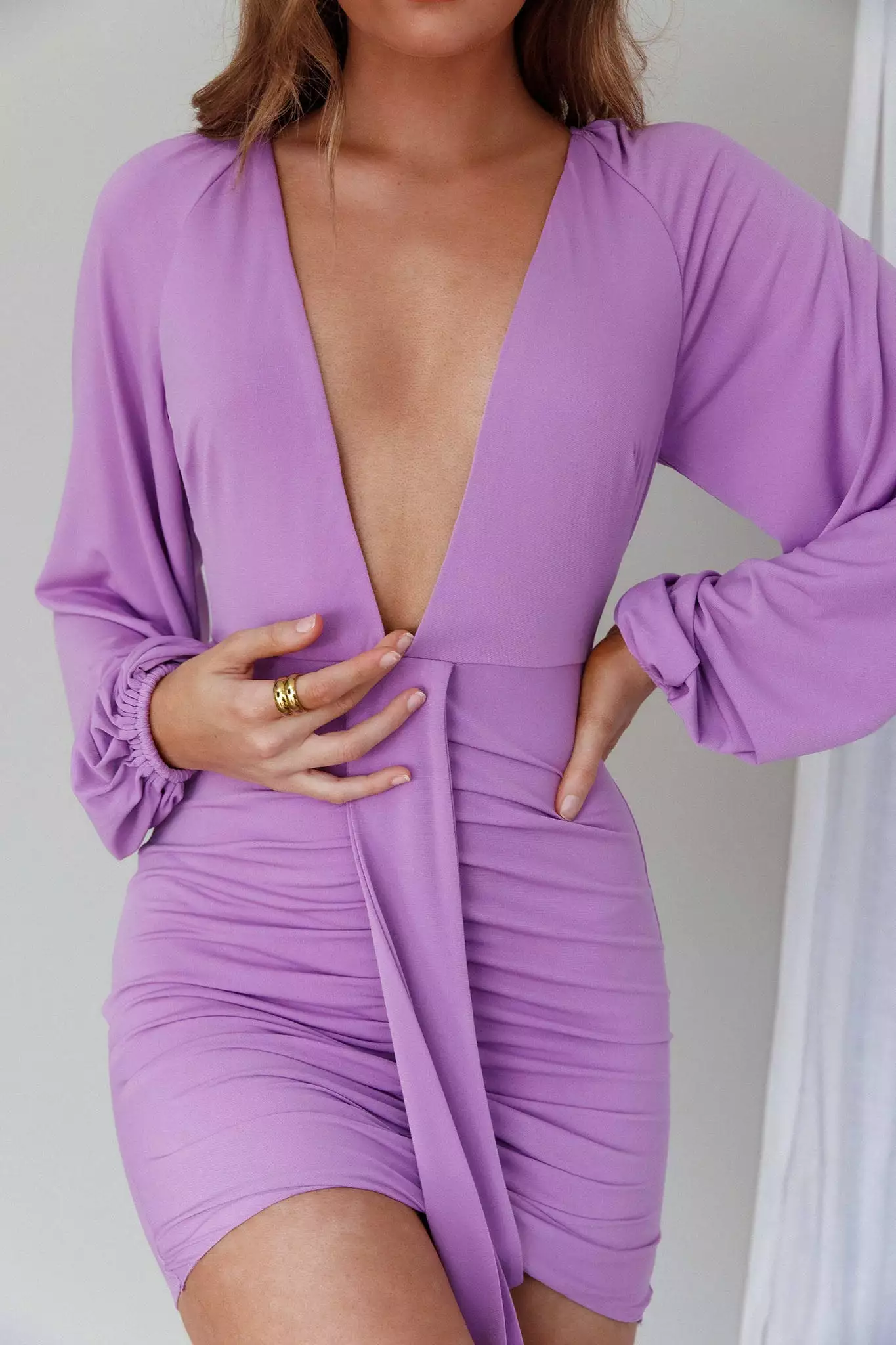 Turn heads in our hot Unforgettable mini dress. We are in love with its plunging neckline and ruching in the skirt. Perfect for a flirty date night or dinner and cocktails with your girls. Team it with nude mules and a tote for an unforgettable look!