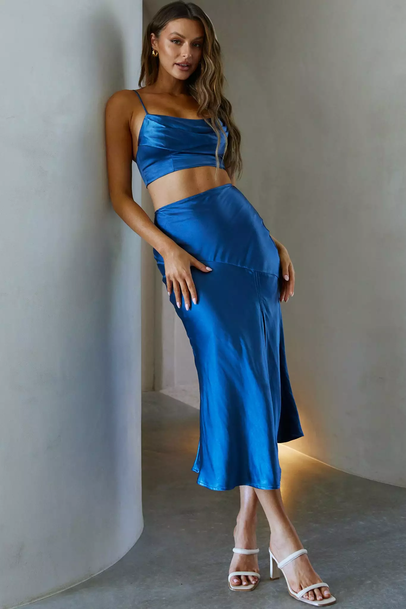 You will turn heads in our gorgeous Well Versed crop top. We are obsessed the pleated detail in the bust and soft, satin fabric. Perfect for romantic date nights with bae teamed with its matching midi skirt and tan, strappy heels.